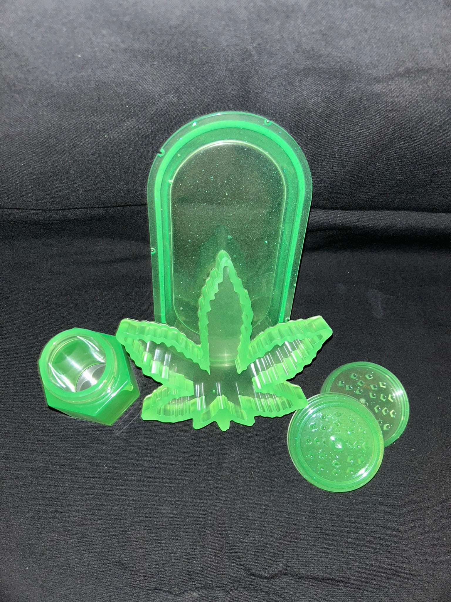 | Sai's Highs handmade accessories sets are made of a durable resin and colored with micro powders. Each set has one large tray, one grinder, one ashtray, one bottle and one small tray. | |||||||